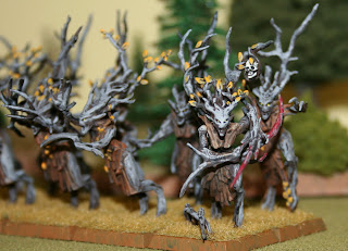 Here is a close-up of the Glade Guards. This is the first time I am painting a 25/28mm army and the learning curve was not too steep, thanks to all the precious tips that were generously provided by master painter Curto Da Vinci. I've tried various colors for clothes, leather armors and hair. Not all combination of base color/highlights were successful, but I will re-use the best ones for the next batches. I digressed from GW usual bright palettes with sharp contrasts for something darker and a lot more toned done, more in the line of their "Lord of the Ring" collection. I opted for a Fall palette of colors. The next Regiment I will be working on will be a lot more yellowish. If you know a few painting tips that could help me improve my next batch of Wood Elves, please do not hesitate to let me know.The codex says that Dryads cause fear... This is one skull holding angry plant that I would rather avoid. I've painted the bark and leaves in a way to suggesting Autumn. I found these tree creatures very pleasant to paint. Actually, it was like painting scenery. The base could use more work. From this angle, it looks like the Dryads are walking on a carpet. For the next batch, I intend to use a gel with beads that Curt recommended.