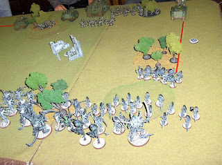 We played a tables quarters style scenario from Mechani-Kon. MikeA played well, initially controlling or contesting all quarters, but the mobility and durability (durability - wtf?) of the Eldar proved too much for the Chaos forces. The turning point occurred mid-game, when Typhus and his bodyguards fell to a fusillade of melta and shuriken fire.