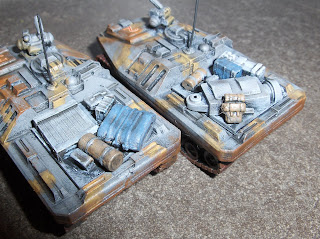 Rebel ran a great sale a couple weeks ago, so I took advantage of it to order some combat flatbeds, more Earth Force Marines, and a copy of their Modern Havok rules. First onto the painting table were the combat flatbeds. Gilles applied the standard paintjobs but I decided to increase their flexibility a bit by modelling some cargo.