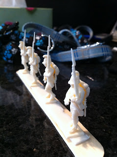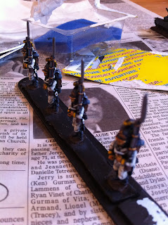 With each infantry battalion clocking in at 38 foot models and one mounted officer, that's a fair chunk of painting - 156 models, I think. On the plus side, however, I've got a fair bit of experience painting Austrian infantry figures, so the job goes very fast. Up first is a battalion of Foundry castings with yellow facings (a picture of the first "stick" is above). I've already finished 19 foot troops and one mounted officer for these guys in just over three weeks.