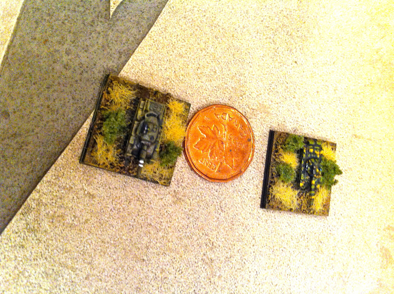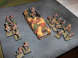 Troops are classified as "Inexperienced", "Regular", or "Veteran", with a corresponding Morale rating of 8, 9 or 10, respectively. "Morale" equates to "leadership" in the Warhammer paradigm, with checks taken on 2d6 and a "pass" being a roll equal to or lower than the Morale value. Each Pin on a unit adds one pip to the roll (making it harder to pass) and the presence of an officer subtracts. At 1300 points, the Canadians deployed an HQ section, three 10-man infantry sections, an MG section with Carrier, a PIAT team, two Shermans and a Sherman Firefly, all Regular. The Germans got three 9-man sections each with a Sdkfz. 251, an HQ group, a Panzerschreck team and a Hetzer, all classed as Veterans.