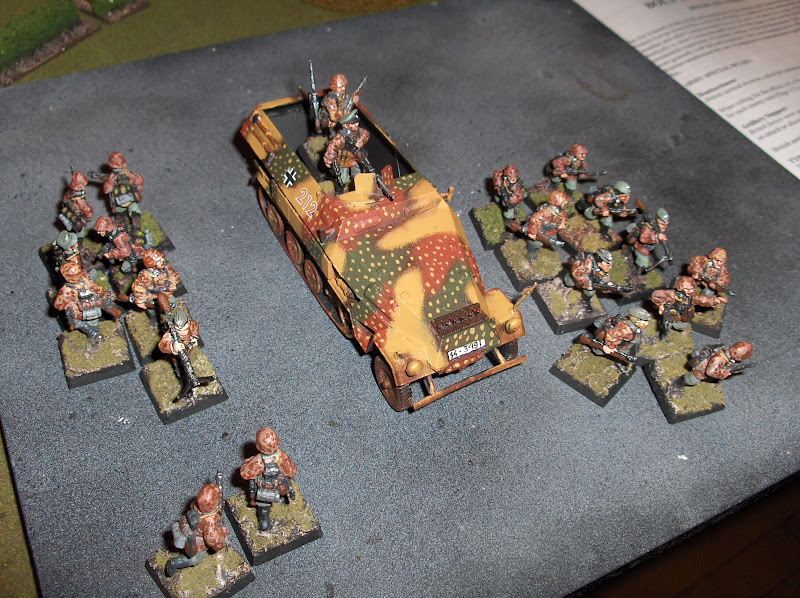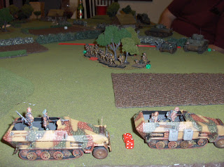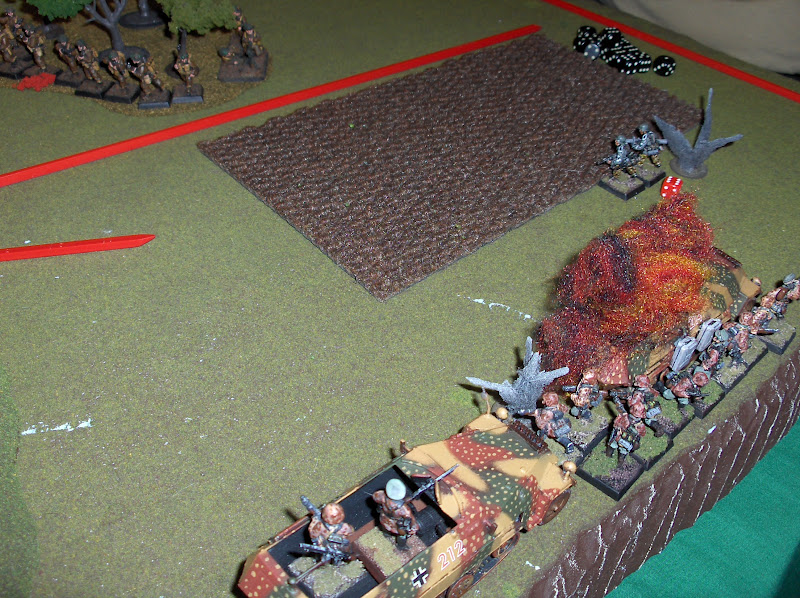 One of the Hanomags is destroyed as the Panzerschreck team at the edge of the field tries to cover the advance. Passengers in destroyed vehicles are not automatically killed, but the consequences of this happening in our game tended to be not very severe. Would like the thoughts of others on that, but my sense is that it would be pretty disconcerting to be riding in a 251 as it is destroyed by AT fire.