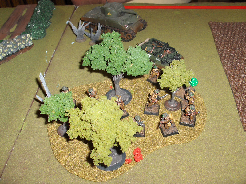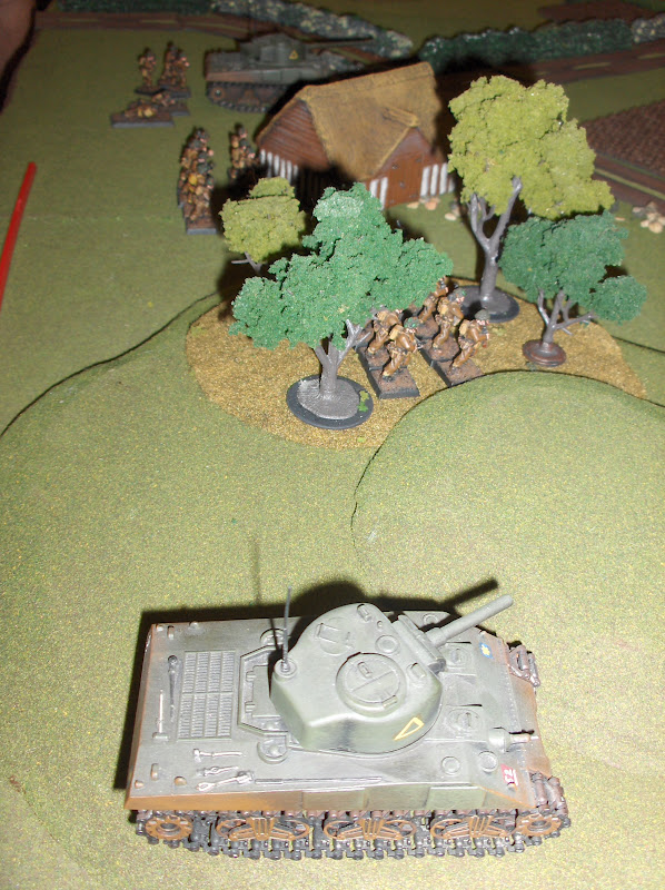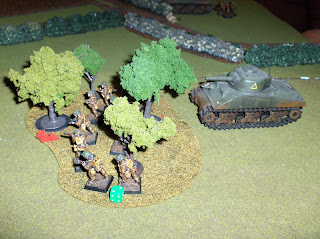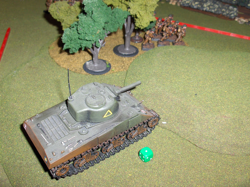 The Firefly failed its Morale check to fire at the approaching Germans and goes Down instead... which for a vehicle means reversing away from the nearest visible enemy. I like this mechanic as it seems realistic... I imagine that the Firefly crew imagined the woods to be crawling with Panzerfaust-toting SS maniacs and decided that discretion was the better part of valour!