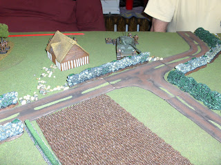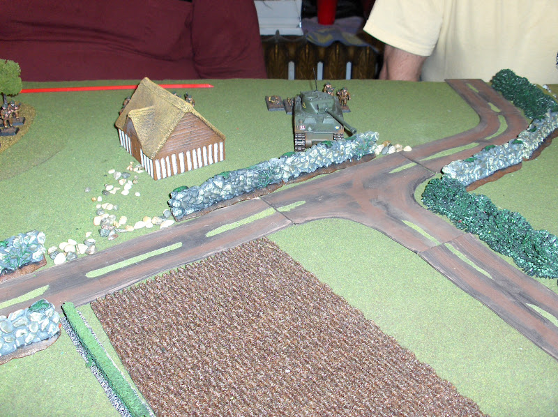 Conscripts Bill, Frederick, Brian and Dave V. came out for the game. For our battle I laid out a 6'x4' table of typical French countryside. A small cottage and barn, some fields and stone walls and hedges, woods and hills. We were playing a late-war battle between Canadians and Germans, at the 1300 point level. (BA provides a points-based army list document for each of the major combatants of the period - British/Commonwealth, American, Russian and German). The scenario I chose was "Envelopment" - with equal points, the attacker scores VPs for each unit in the defender's deployment zone or exited from the table at the end of the game. The defender scores VPs for destroying attacking units. The Canadians were defending - you can see a Canadian Sherman and Sherman Firefly, along with a Universal carrier, deployed at left above.