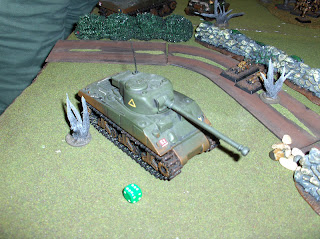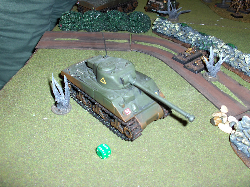 Sherman on "Fire" orders aims at a German Hanomag. Shooting is pretty straightforward in BA - everyone needs a 3+ to hit, modified by range and cover. A damage roll is made for each hit - target number depending on the target. A Regular infantryman is killed on a damage roll of 4+ but it takes a 5+ to kill a Veteran. Armoured vehicles have damage rolls of 7+ and higher - meaning that small arms can never kill an AFV, to do that you need an AT weapon that has a damage roll modifier, sometimes adding 5 or more to your damage roll. A roll equal to the target number is a "glance", a roll exceeding it is a penetrating hit. A roll is made on a results table to determine the damage, and it tends to be deadly... vehicles that are hit and damaged will be on fire or destroyed over half the time.