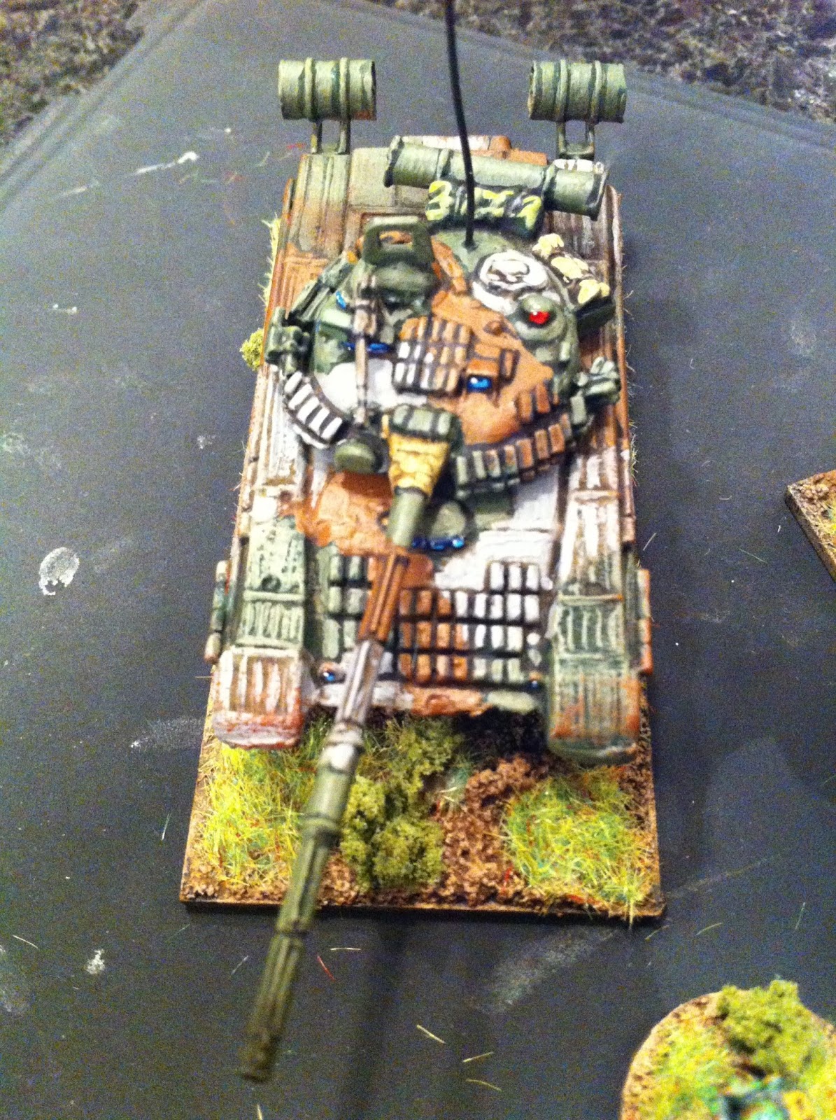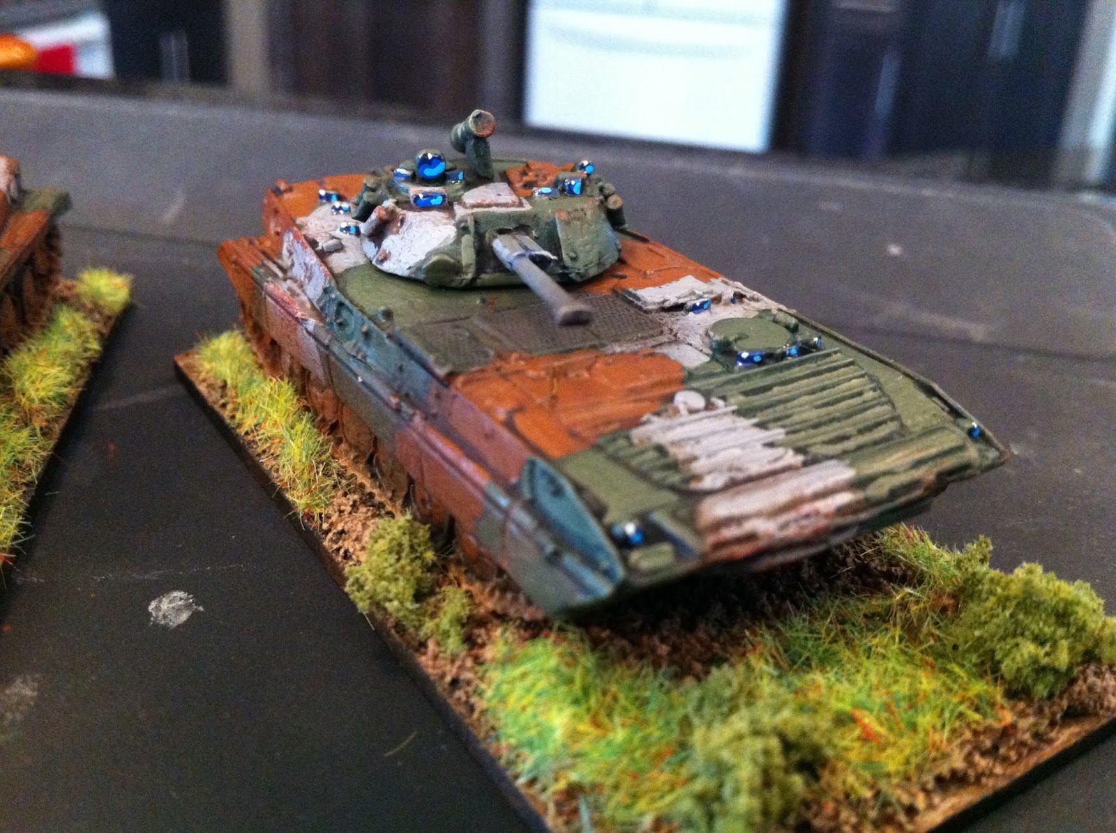 Tim Rich cammo pattern known as "Fulda", a three-tone scheme seen on many Russian AFVs at the time of the fall of the Berlin wall. I'm not sure how widely used it was, but it looks neat, and I was tired of painting Russian stuff just plain green.