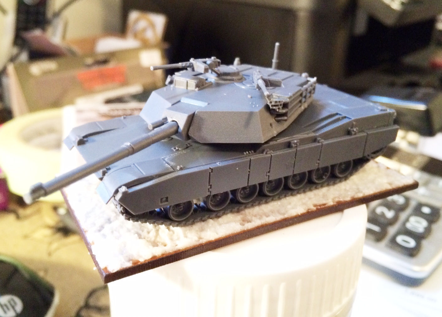 I wanted to start with the US forces first, as I already have some 15mm Soviet kit painted (as does Mike F), so this seems to be a quicker way to get to a test game. The US starter box contains five M1 tanks and a pair of Cobra Helicopter gunships. I stuck together one of the M1s, and I have to say, not too bad. The detail on the plastic is nicer than I have seen on other plastics from BF, though still nowhere near the nice, sharp details you get on properly executed metal vehicles. And the plastic is still a bit brittle for some parts, like the .50cal MGs - use