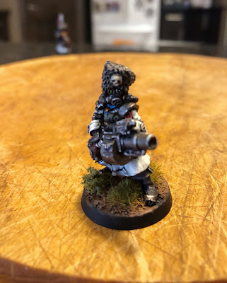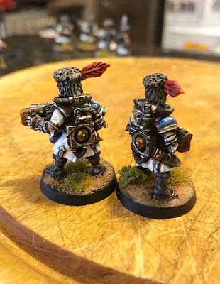 My fifth submission into Curt's Analogue Hobbies Painting Challenge included more metal goodness from GW days gone past. The setting switches from Middle Earth to the grim darkness of the far future, GW's Warhammer 40k. These figures are special weapon troopers for the "Vostroyan" Regiments of the Astra Militarum Imperial Guard. They are 28mm metal castings from GW.