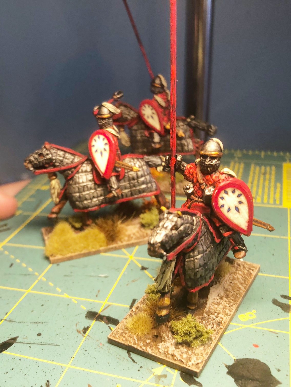 I painted a few weeks ago. I really enjoy these particular Gripping Beast castings, they have a lot of character. Two of the riders are armed with Kontarion, the long spears seen with "eastern" heavy cavalry such as the Byzantines, Sassanids (and others). The other rider is brandishing his heavy mace. These figures are so fun to paint!